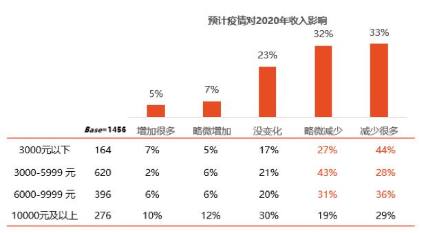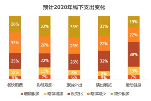 2020年,多数受访者对于线下方面的消费持有谨慎的态度,大约六成的人打算削减在“餐饮消费”之上的支出,大约六成的人打算削减在“影院观影”之上的支出,大约六成的人打算削减在“旅游外出”之上的支出,大约六成的人打算削减在“演出展览”之上的支出,只有“运动健身”相关的支出,其减少的比例是比较低的,这反映出健康类消费的优先级出现了有所提升的情况。