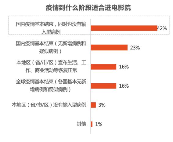 观众针对何时重新回到电影院持谨慎态度,在觉得当下“不适合”前往影院的诸多人员中,大概40%的人觉得,非要等到“国内疫情基本完结,并且没有输入病例”的时候才会安全。这表明出安全感是回归得以实现的前提条件。