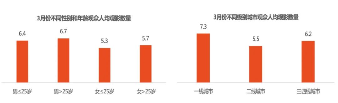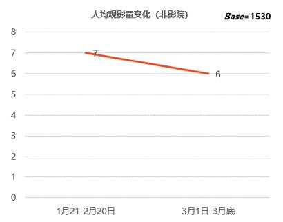 在疫情那段时期,线下的娱乐活动出现了大规模的暂停情况,而线上观影进而成为了主流。在2020年3月的时候,人们平均每人通过并非影院的渠道观看了6部电影,这和2月观看的7部电影数量相差不大,并且远远高于正常年份的水平。这样具有高强度的线上观影体验,在一定程度上对观众的消费偏好进行了重塑。