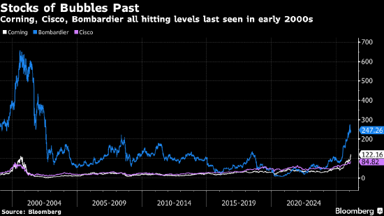 雷诺兹策略公司首席市场策略师布赖恩・雷诺兹指出,时隔 25 年, Corning、Cisco Systems 等互联网泡沫时期的龙头企业,股价终于突破彼时的历史高点。他认为,这对仍痴迷于人工智能头部标的的投资者而言,是一个警示信号 —— 这些企业的股价在近年已上涨两倍甚至更多。