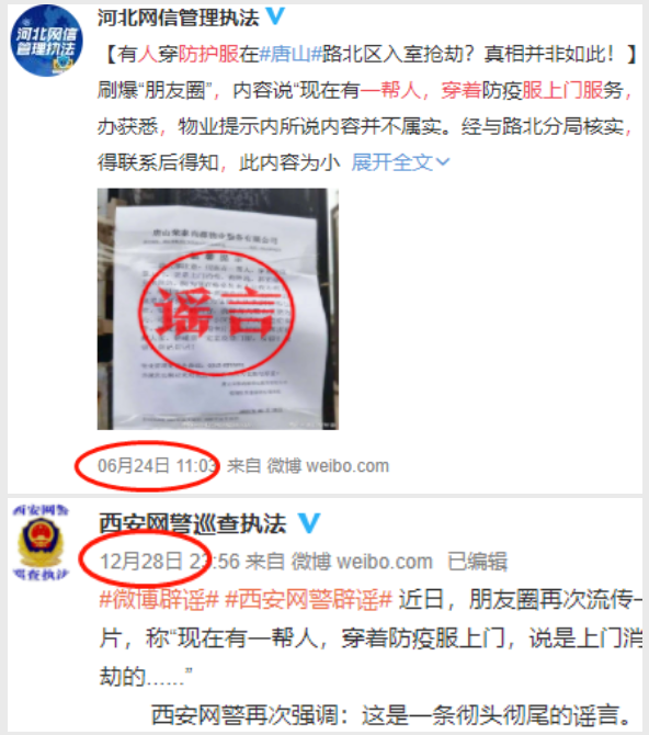之所以这类谣言能够“长寿”,是由于其巧妙地借助了公众在特殊时期的普遍焦虑心理,每当疫情情况变得紧张起来,人们针对外来人员上门的不安之感就会有所上升,旧有的谣言便趁机而入,更换上新的日期再度进行传播。