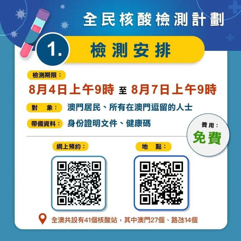 为达成全民检测这项重任,特区政府于全澳各处设立了四十一个检测点,且保持二十四小时开放的状态。自八月四日凌晨起始,便陆陆续续有市民前去排队。于澳门综艺馆等主要检测点,哪怕是在深夜时分也排成了长队。
